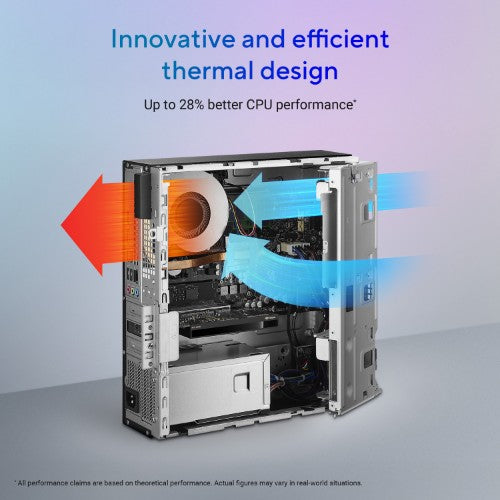 Powered by Intel® Core™ i7 processor with 16 GB DDR5 RAM, ASUS ExpertCenter P500 SFF makes light work of all your business tasks. Paired with the compact air cooler thermal system, ASUS ExpertCenter P500 SFF is capable of unleashing 45W TDP1, optimising CPU power to deliver up to 28% better performance than a traditional commercial desktop of a similar price range2.Precision cooling, maximum performance