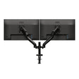 Dual monitor arm for up to 32“ displaysThe gas-spring loaded, sleek AD100 dual monitor arm can be clamped to desks, holds two displays up to 32“ size. 360° pivot range, wide tilt range, 320 mm height range delivers huge flexibility.