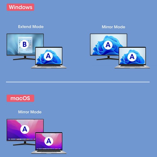 - Supports display modes Extended or Mirror on Windows®, and Mirror on Mac®
