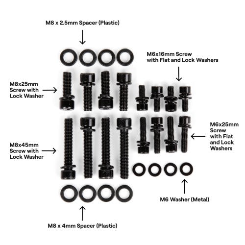 | Packaging content | Owl Bar TV Mount (QTY 4) M8x45mm Screw w/ Lockwasher (QTY 4) M8x25mm Screw w/ Lockwasher (QTY 4) M6x25mm Screw w/ Flat and Lock Washers (QTY 4) M6x16mm Screw w/ Flat and Lock Washers (QTY 2) M8 x 10.5mm Spacer (Plastic) (QTY 4) M6 Washer (Metal) (QTY 4) M8 x 4mm Spacer (Plastic) (QTY 4) M8 x 2.5mm Spacer (Plastic) (QTY 1) 5mm Hex Wrench (QTY 2) M4x5mm Screw |