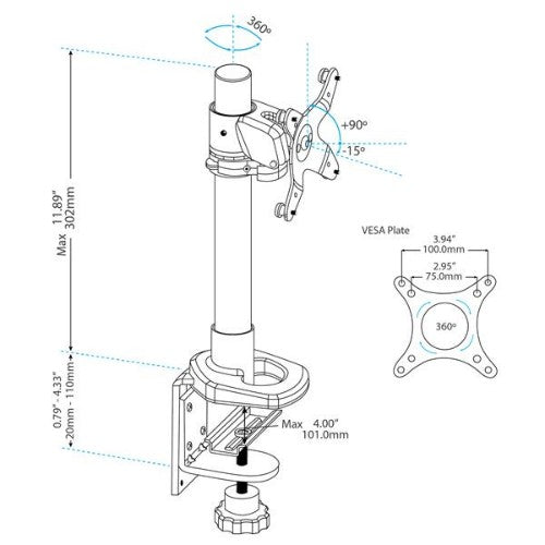 The height adjustable monitor arm features an 11.89" (302mm) tall support post, so you can adjust the height of your monitor along the pole.