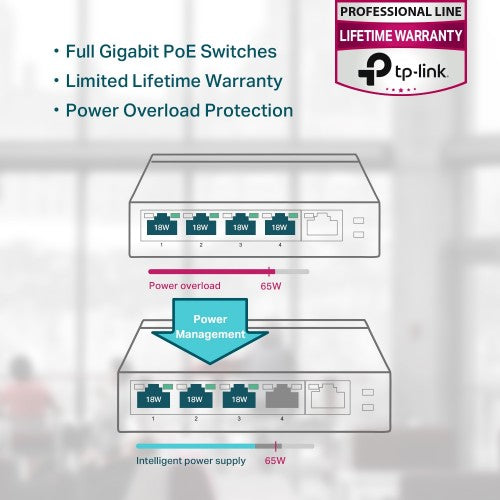 When total power consumption exceeds 65 W, the intelligent power management will cut the lower priority port power. This ensures the high priority port’s power supply and protects the device from power overload. It also automatically detects and provides the required power for your PoE devices while protecting your PoE and non-PoE equipment from being damaged.
